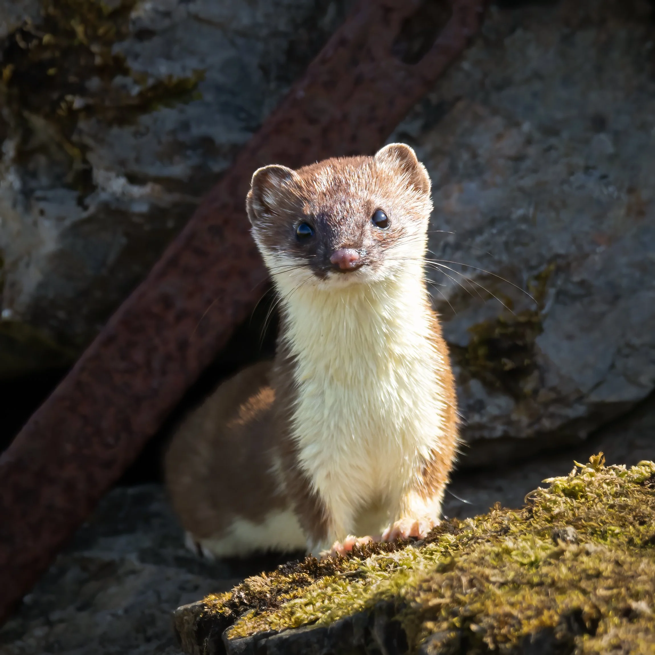 Stoat. Durness, on the northern coast of Scotland, is known for bird and other wildlife. I had been watching the flight and courtship of lapwings at the edge of a small lochan when all of a sudden this stoat appeared about three metres away and stopped dead in its tracks as it saw me. I thought that I should not move for a bit, so that it might get used to my presence and I could then slowly turn and photograph it; unfortunately it almost straight away ran past me and entered a reed bed at the shore of the lochan; I hadn’t managed to photograph it. Later in the day I had travelled around the lochan and seen various other species such as hooper swans and several varieties of duck, then, before leaving in the late afternoon, I thought I would briefly return to my original spot, on the offchance that the stoat would return from the reed bank. I couldn’t have been more surprised when this is what actually happened. This time I managed to observe the stoat for several minutes. I’m really pleased with the close-up images I got, although I would prefer not to have had to include the bit of scrap metal which the stoat was standing in front of.