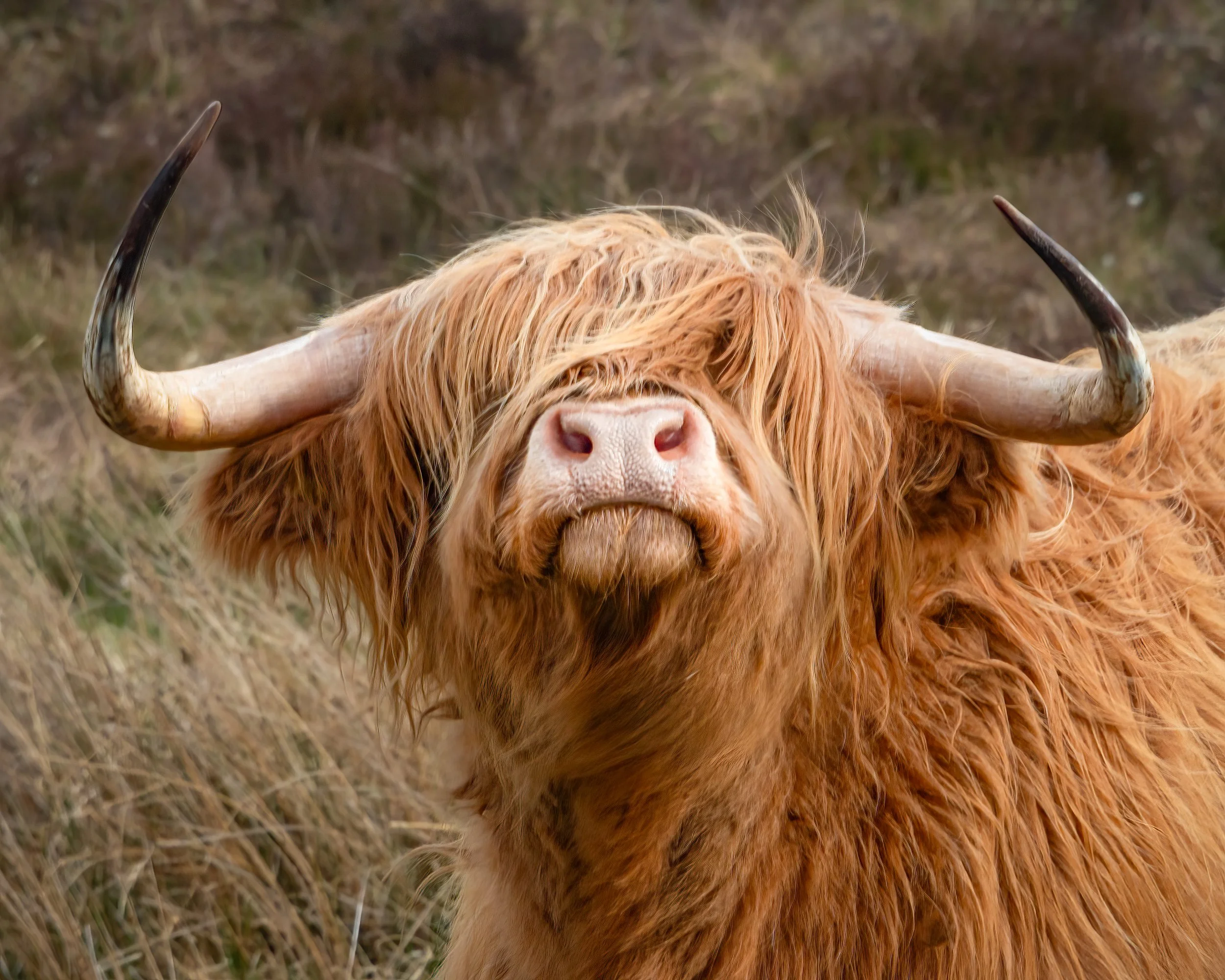 Highland Cattle demand to be photographed. I’ve got two images here. This one, taken near Garve in the Scottish highlands, is a close-up, with a hint of one eye visible and its head raised as if saying “yes, and what do you want?”. The horns and shaggy hair make its look irresistible. A photo like this has to be very sharp, especially the mouth and nose area in the centre, but above all expressive.