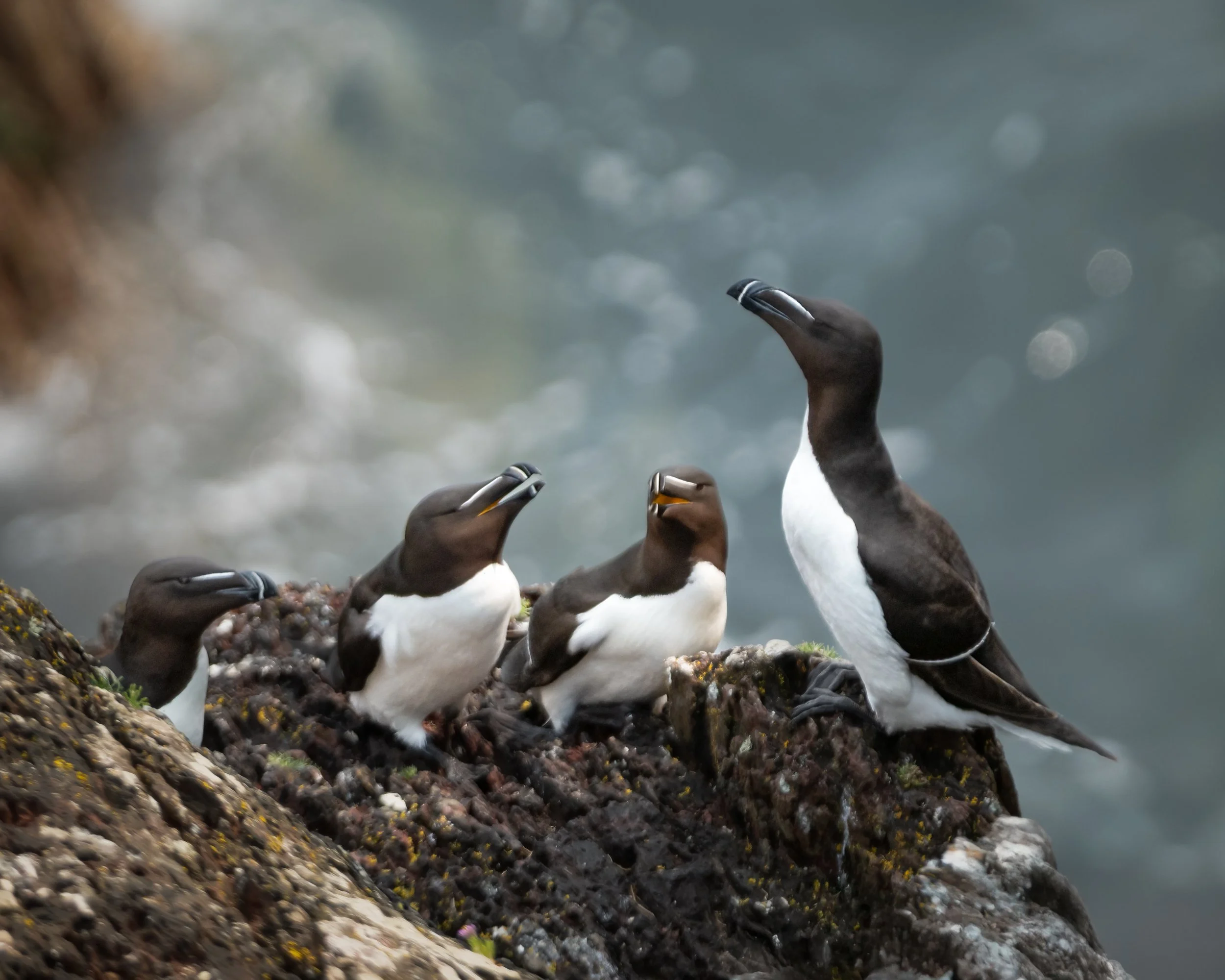 On the islands of Skomer and Skokholm the razorbills are as numerous as the puffins, and although they don’t have the brightly coloured beak of the puffin, their looks are equally fascinating with the white lines going from the eye to the beak and then from top to bottom of the beak; also on the edges of their wings. Razorbills nest on the cliffs and you can frequently see them together as a pair showing affection to each other in various ways. Their flying style is similar to that of the puffin. The razorbills in this image are on Skokholm