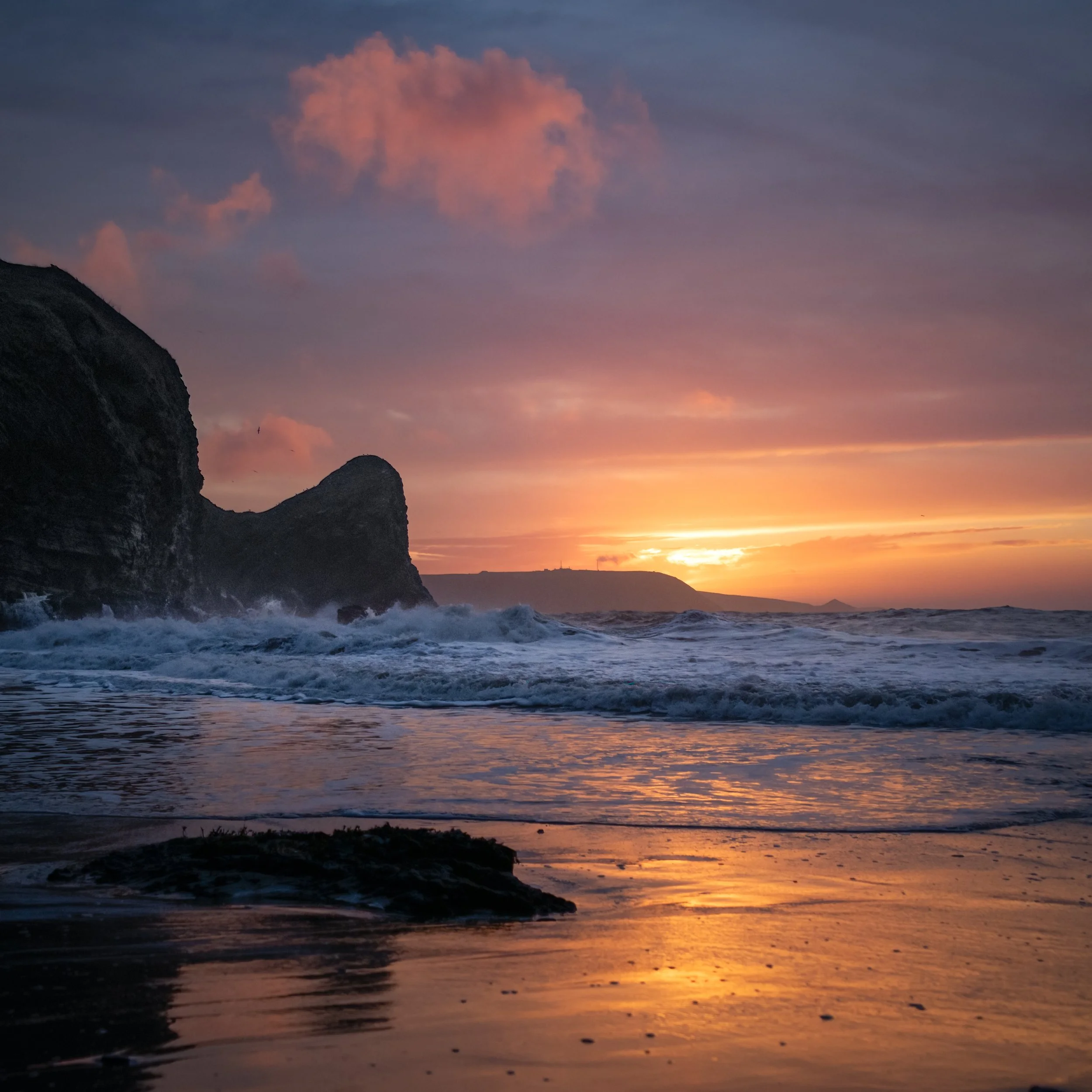 A lovely sunset at Llangrannog beach in Ceredigion. I kept low to maximise the golden reflections in the sand and water, and timed the photo to include a breaking wave. Aberporth and the tell-tale shape of Mwnt are seen in the background, and the imposing profile of the cliff and rock on the left are as much a feature of Llangrannog as the more well-known Carreg Bica which on this occasion is behind the camera…