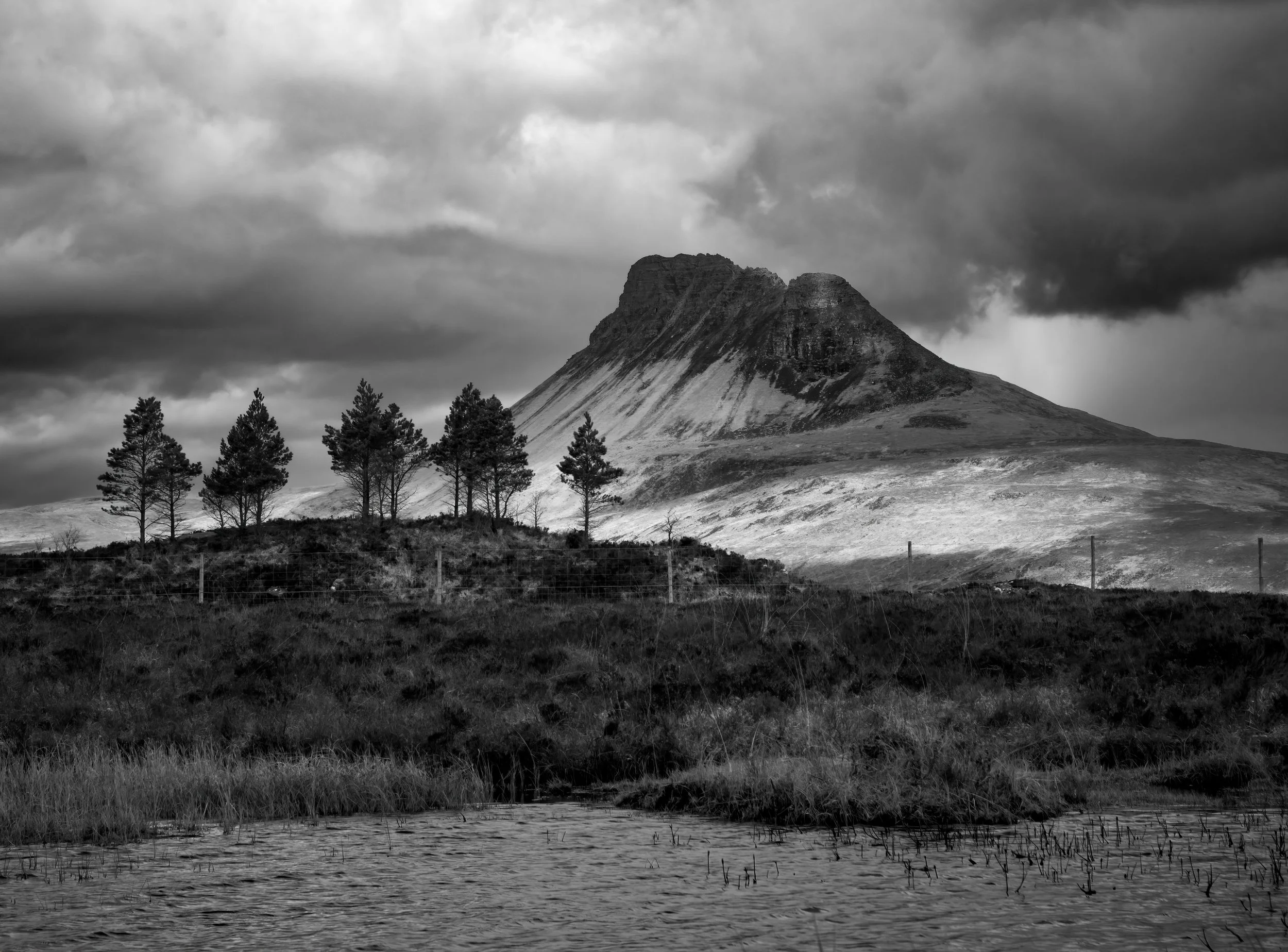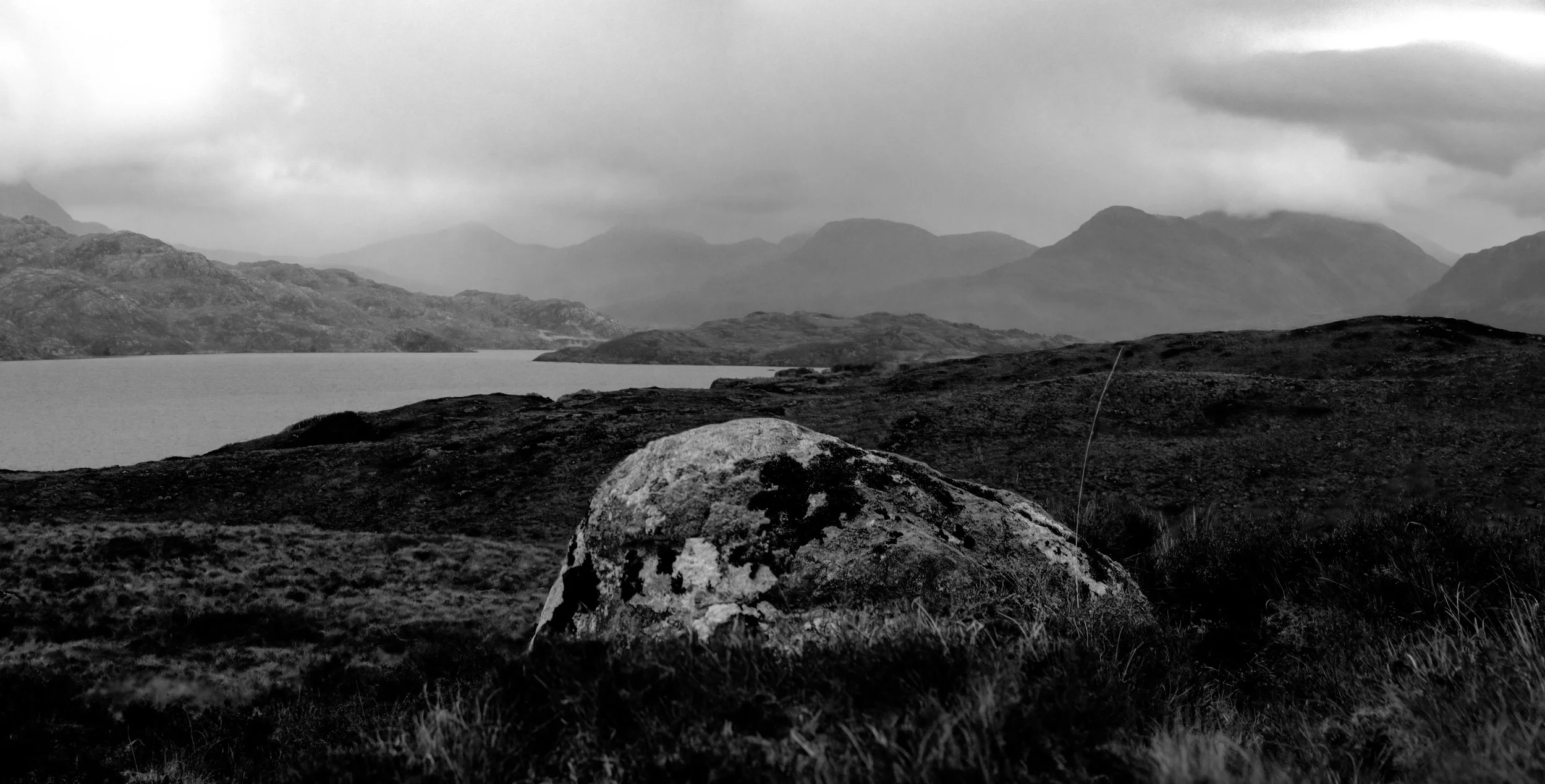 My trip to the North West Highlands of Scotland in April/May 2024 started off fighting to regain my strength after a fairly severe bout of Covid. Having spent time in the far North at Durness, I drove a round trip via Lairg back to the Assynt region. As I drove Westwards, the familiar profile of Suilven emerged. Like all the Assynt peaks, Suilven stands alone and majestic. Being a very long way from any road it isn’t a peak that can easily be climbed in a single day. Although very well-known to anyone familiar with Scottish mountains, it became known to a much wider audience with the film “Evie”, featuring a recently widowed old lady who determines to climb it; it’s a lovely film, featuring Sheila Hancock. One way to approach the mountain is by kayak, on a long thin loch (Loch Veyatie) which eventually takes you to near the base of the mountain. On this occasion I realized from the map that I was very near the beginning of this loch, and I might be able to get an interesting photo of Suilven using the loch as a foreground. I took my gear onto what I thought was a path, but this rapidly petered out, after which I stumbled over very uneven and boggy ground and hidden rocks under the scrub, and eventually reached the loch: I was totally exhausted, still very weakened post-Covid. It took me some while to find a picture I was happy with - a wide-angle lens placed low and very close to the collection of rocks in the water meant I could frame the mountain nicely with a very long exposure picture. From the moment I saw this opportunity I knew it would favour a black-and-white interpretation.