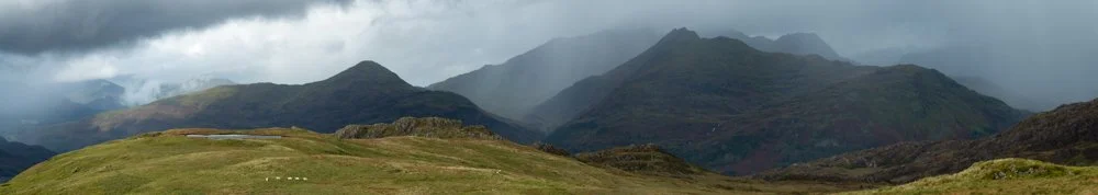 This is such a long panorama (and I don’t want to crop it) that even on a biggish screen it looks quite small, but it’s one of my images that I’d most like to see printed out as an enormous print about six feet long or more. I love this image, taken from the slopes of Cnicht of Yr Wyddfa (Snowdon) and the main central Eryri area. I’d thought I would climb Cnicht, which is a favourite of mine and never overcroded, but the rain came lashing down relentlessly. Despite the appearance of a group of student cartographers I still managed to get lost, and in the end thought I would spend the time photographing the westerly view. I was richly rewarded with incredibly dramatic light and cloud formations over yr Wyddfa. I took many sets of images with different light and cloud conditions, but the one above remains my firm favourite. Despite its long aspect ratio, I thing the structure of the photo is still strong, and the features of the light throughout the image apparent to the viewer.