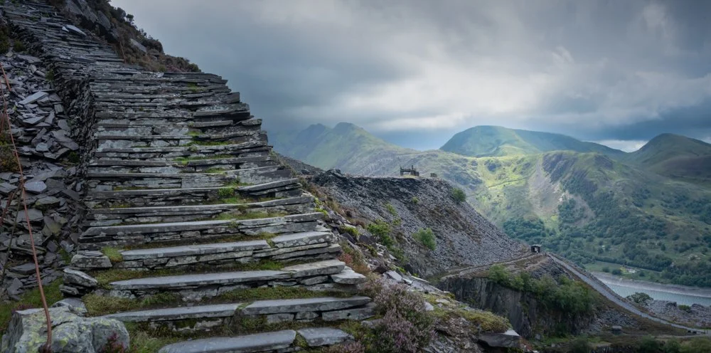 I am always moved and humbled when I visit Dinorwic slate mine in the heart of Eryri (Snowdonia). At its height tens of thousands of miners worked here at what was the second largest of its kind in the world. There is a haunting quality to the remains of buildings, train tracks, caves, huge mounds of slate, stairs and abandoned equipment. This was an incredibly hard life for those who worked here, and a dangerous one. I was thinking that I had done well to climb all the various levels of the mine up to a high point on the mountain; yet these miners would have to do exactly the same every day, and once at the top they had to do a long day’s work and then descend; I was only taking my time and creating photos! This photo shows the staircase which rises steeply from one level to the next, as well as the building right in the centre on the ridge with an illuminated mountainside behind. I wanted the elegant lines of the sides of the stairs, winding up and to the left, to be complemented by those of the mid-ground and the more distant hills. The view of a slice of Llyn Padarn at the bottom right gives a sense of how high the mine is above the valley floor. The grey and moody weather helped in creating a sense of the place and its history, and a memory for all those who worked here in such hard conditions.