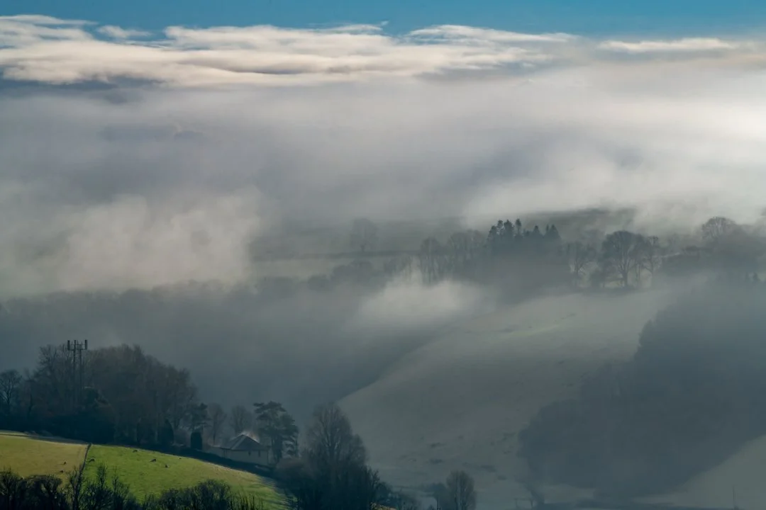 Carmarthenshire is a large county in West Wales, and one where I have my home. It is hugely varied, with a coastline of beautiful beaches, mountains which form the Western part of the Brecon Beacons, miles and miles of rolling countryside with farms and woodland co-existing, and many glorious river valleys, the Tywi and Teifi being but two. In this image of the hilly countryside near Cynwyl Elfed, mist from the valley of the river Gwili hangs above the fields and woodland. A very typical scene from the area in which I live.