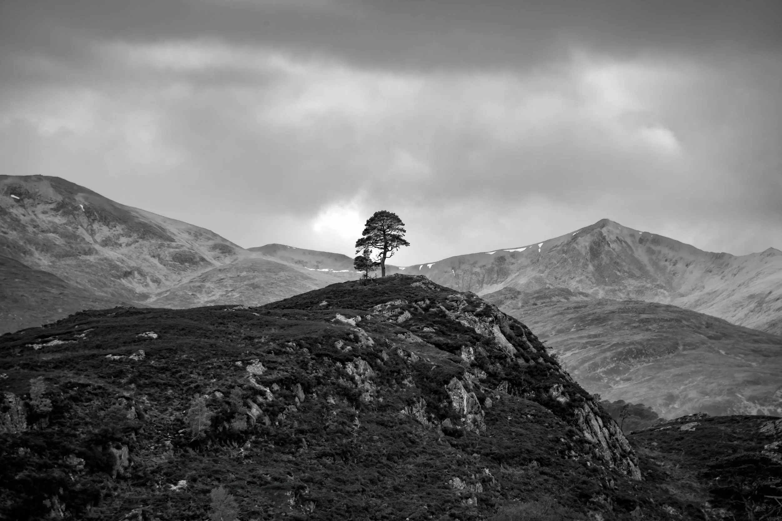 On my visit to Glen Afric in May 2025 I fell into conversation with a local gentleman who was out on the loch in his kayak. He agreed with me on how beautiful the glen was, but that it was now having to cope with very high visitor numbers; “however,” he said, “there are a couple of equally beautiful parallel glens nearby which are not so well-known”, and he in particular recommended Glen Strathfarrar. Like so much local advice this was spot-on! In order to get into the glen, you need to register your car as you enter and agree to be out by early evening. Straight away I could see I was entering a paradise: beautiful woodlands, streams, rock formations, hills on each side becoming steeper and higher the further one went up the glen. It was totally enchanting. Some way up I spotted this Scots Pine atop a hill. I’m not usually one to get unnecesarily overexcited by a “lone tree” (unlike almost every other landscape photographer I know of!), but I could see a fairly epic photo here which showcased the hills and mountains of the glen and conveyed a real sense of place. The main thing here was getting the ideal visual relationship between the tree, the hill whose top it is on, and the background mountains. By moving closer or further I could make the tree above the distant horizon, below it, or, as I finally decided, intersecting it near its base. This was always going to be a monochrome image with the tree silhouette, the different shades of grey for the overlapping layers of hills, and the patterns on the hills caused by the rocks and vegetation. To get this image, a considerable zoom was needed; however, this also helps to achieve the effect I wanted, as it “compresses” the distance between the various elements to help create a unified image.